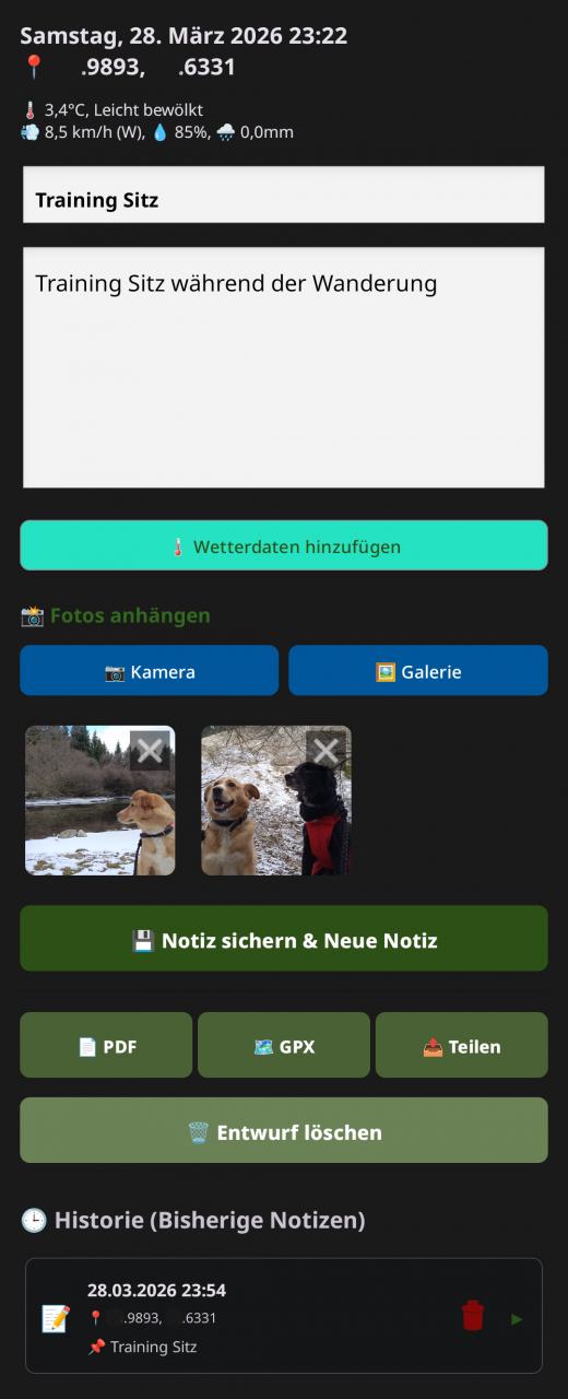 Digitales Trainingstagebuch mit Foto-Upload, optionalen Standortwetterdaten zur Notiz, automatischem GPS-Tagging, automatischer Sicherung und PDF-Export-, Teilen- und GPX-Exportfunktionen.