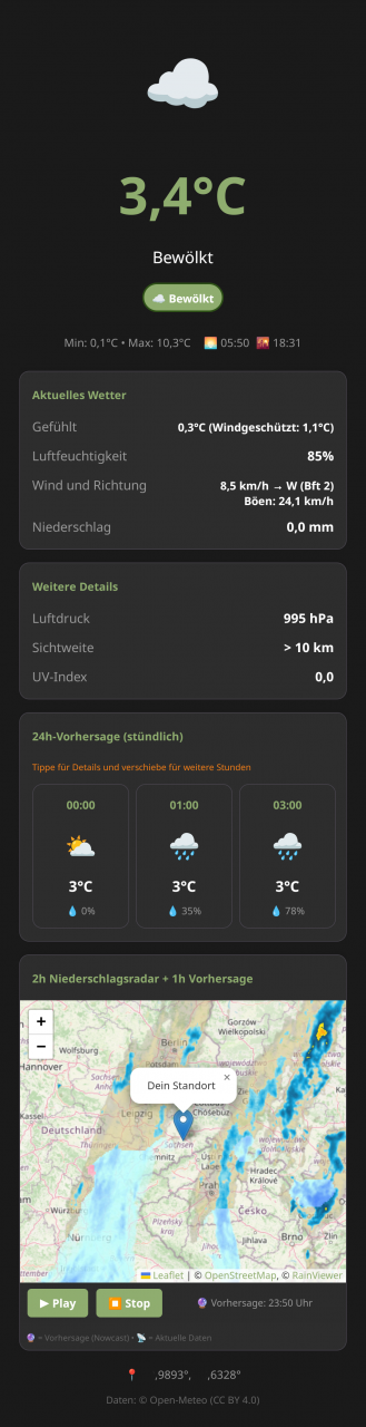 Aktuelle Wetterdaten und Vorhersagen für den Standort. Abruf über die freie Open-Meteo API und das RainViewer-Radar – ohne Tracking durch Google oder andere kommerzielle Wetterdienste.