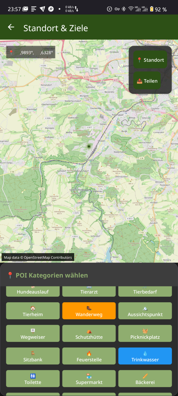 - Standort-Zentrierung: Über den Button „📍 Standort“ lässt sich die Karte jederzeit wieder auf die aktuelle Position ausrichten.