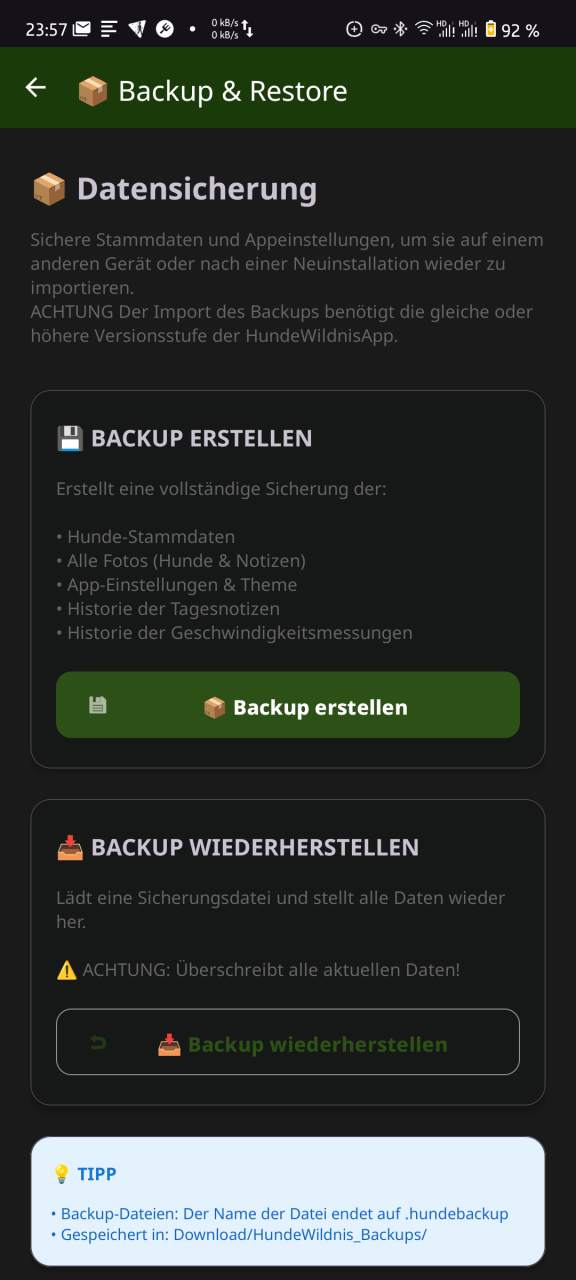 Komplette Sicherung und Wiederherstellung aller angelegten App-Daten lokal auf dem Gerät. Das Backup kann auf Wunsch auch geteilt werden, um es auf weiteren Geräten bzw. nach Neuinstallation in die App zu importieren.