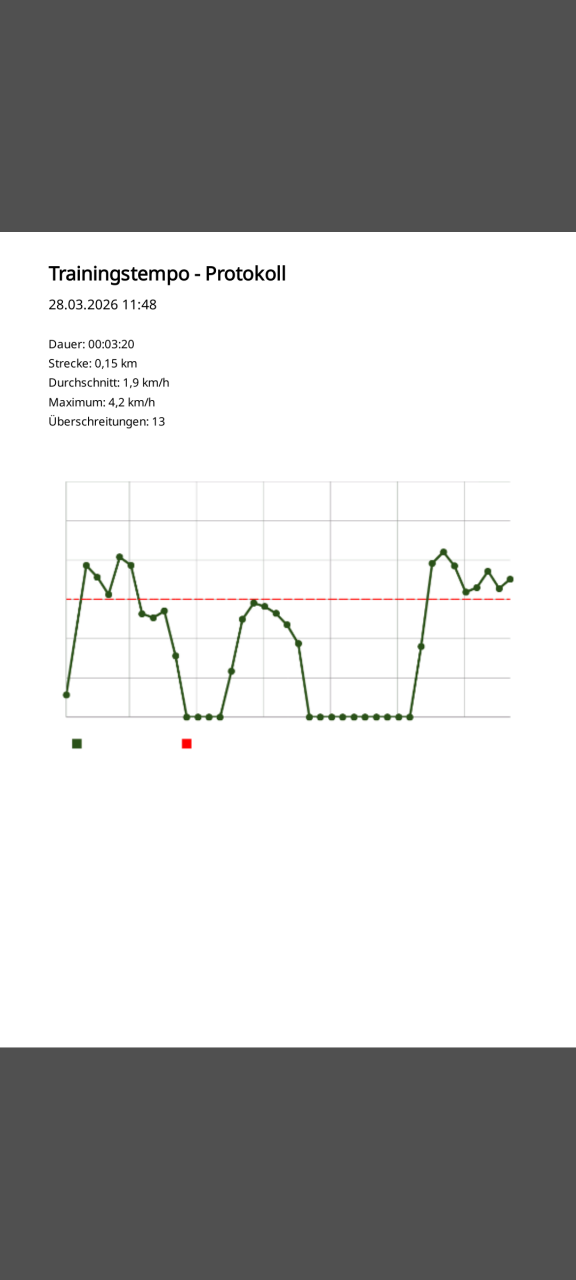 Echtzeit-Überwachung der Gehgeschwindigkeit in verschiedenen Trainingsszenarien mit Warnfunktion, grafischer Auswertung, Speicherung und GPX/PDF-Export mit Teilen-Option.