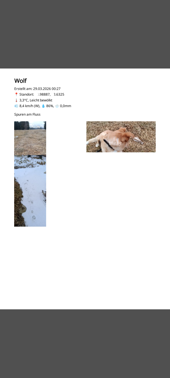 Keine Cloud-Synchronisation – alle Daten (GPS, Fotos, Notizen) bleiben lokal auf dem Gerät.